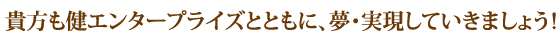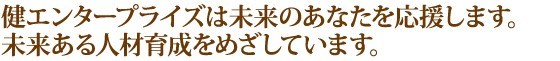企業家として、将来、地域社会に貢献していきたいとお思いの方。健エンタープライズが応援致します。誰でも初めは未経験です。あなたのやる気を買わせてください。